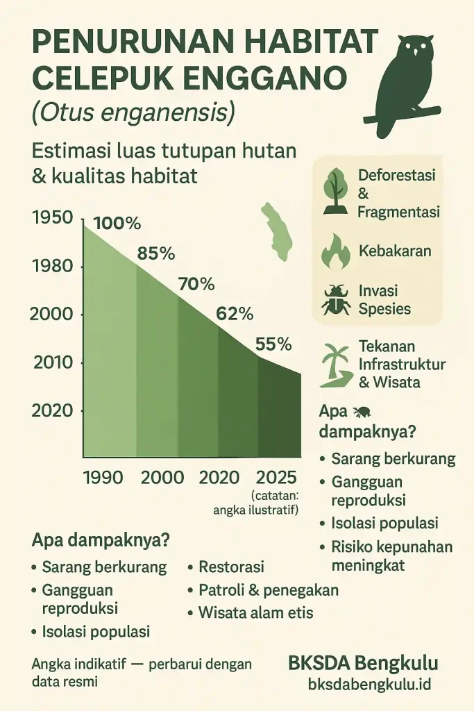 Preferensi habitat yang sangat spesifik ini membuat Enggano Scops-owl sangat bergantung pada kondisi ekosistem hutan Enggano yang utuh.