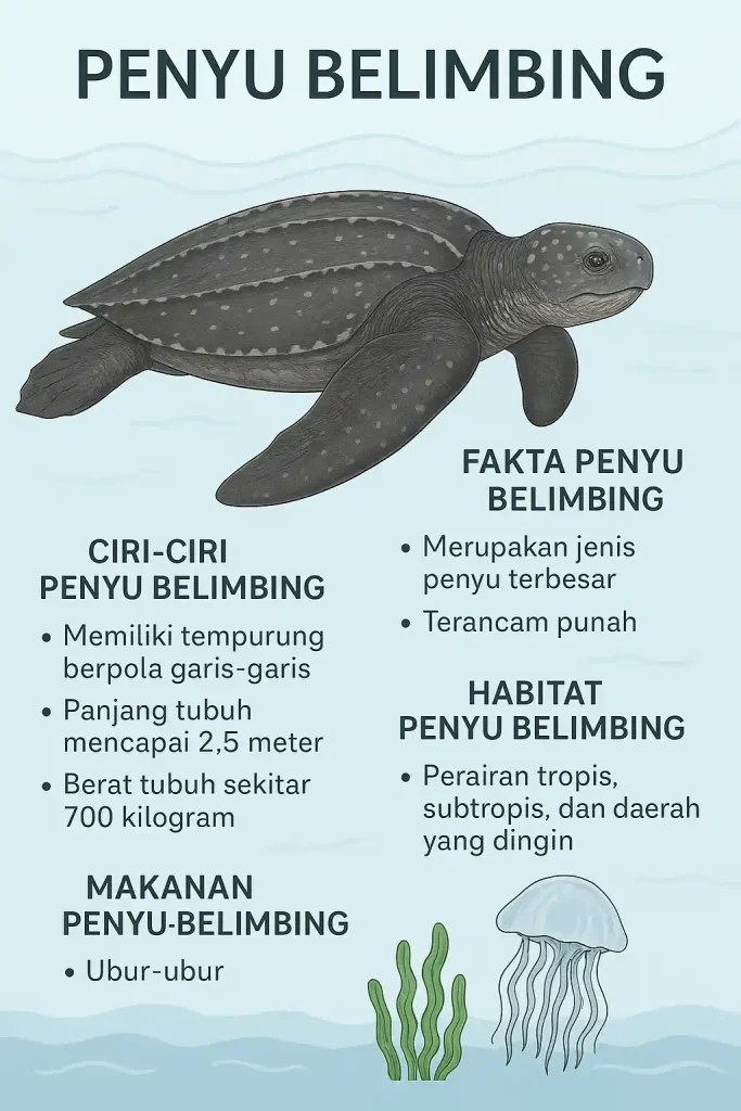 Penyu belimbing (Dermochelys coriacea) adalah penyu laut terbesar dan salah satu satwa paling unik di perairan tropis maupun lintang sedang. Banyak orang membayangkan penyu selalu memiliki tempurung keras. Penyu belimbing justru sebaliknya: punggungnya tersusun dari lapisan kulit tebal yang lentur dengan pola garis memanjang, sehingga tampak berbeda dibanding penyu hijau atau penyu sisik. Keunikan bentuk ini bukan sekadar “ciri fisik”, tetapi juga berkaitan dengan kemampuannya menjelajah samudra, menyelam dalam, dan bertahan di perairan yang lebih dingin.