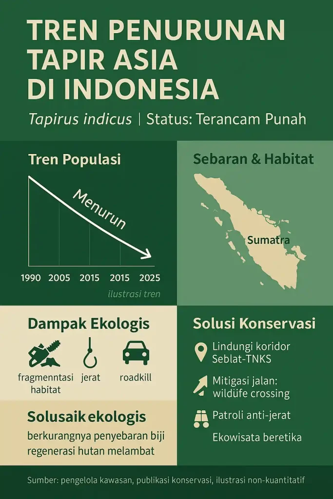 Berbeda dengan satwa berkelompok, tapir asia bersifat soliter dan cenderung menghindari manusia. Aktivitas malam serta habitat rapat membuat pendugaan populasi menantang. Secara umum, populasi tapir di Sumatra menunjukkan kecenderungan menurun di luar kantong habitat besar yang masih tersambung. Kawasan dengan patroli rutin, minim pembukaan jalan baru, dan koridor yang terjaga cenderung mempertahankan keberadaan tapir lebih baik. Bukti dari kamera jebak dan temuan jejak lapangan adalah indikator yang paling konsisten untuk memantau tren, seraya terus memperbaiki metodologi estimasi.